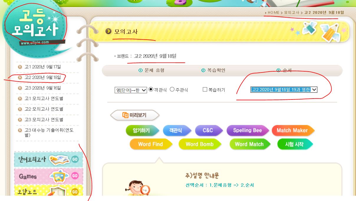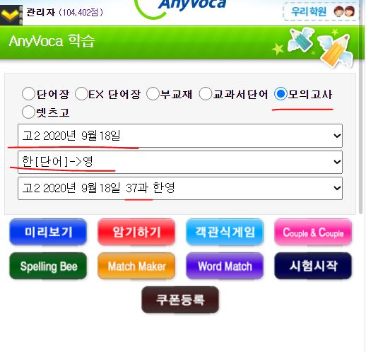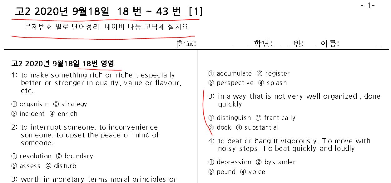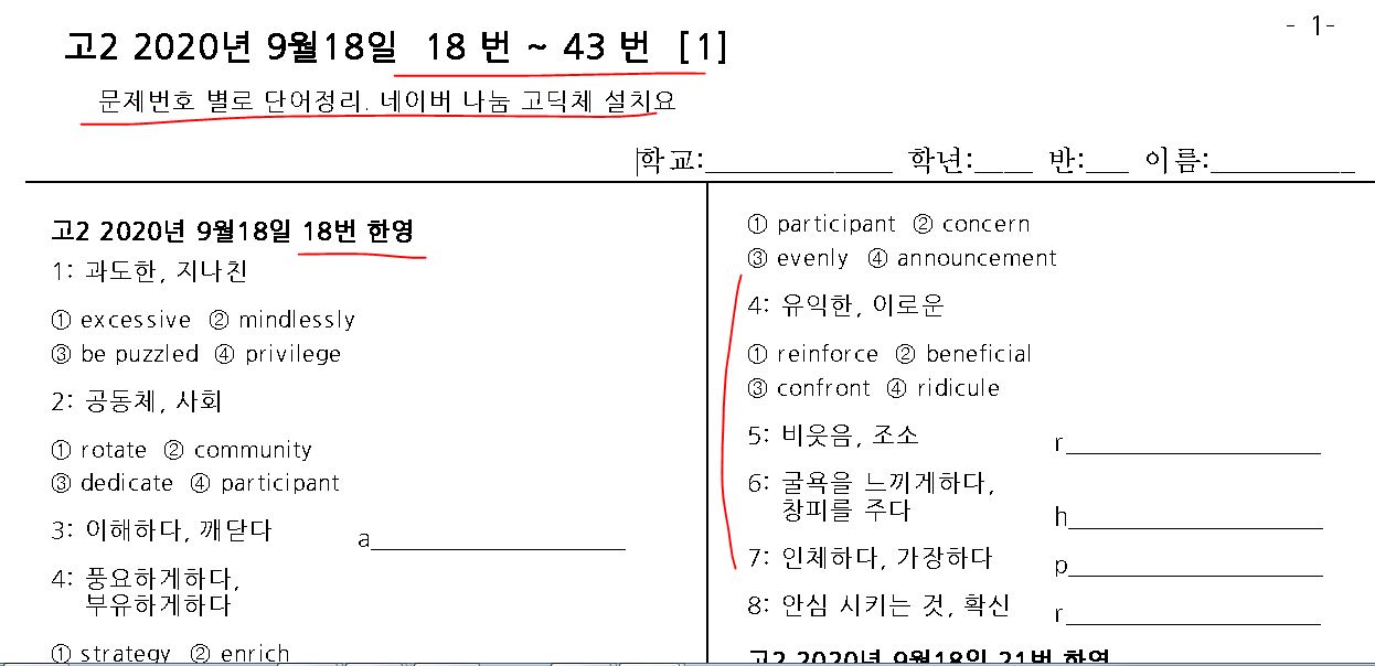 제목과 같이 2020년 9월18일 고2 영어모의고사 어휘시험지 입니다.
