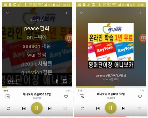실제 2명의 원어민 음성파일에 알송앱으로 자막처리 하여 스마트폰에서 글자를 보면서 영어단어를