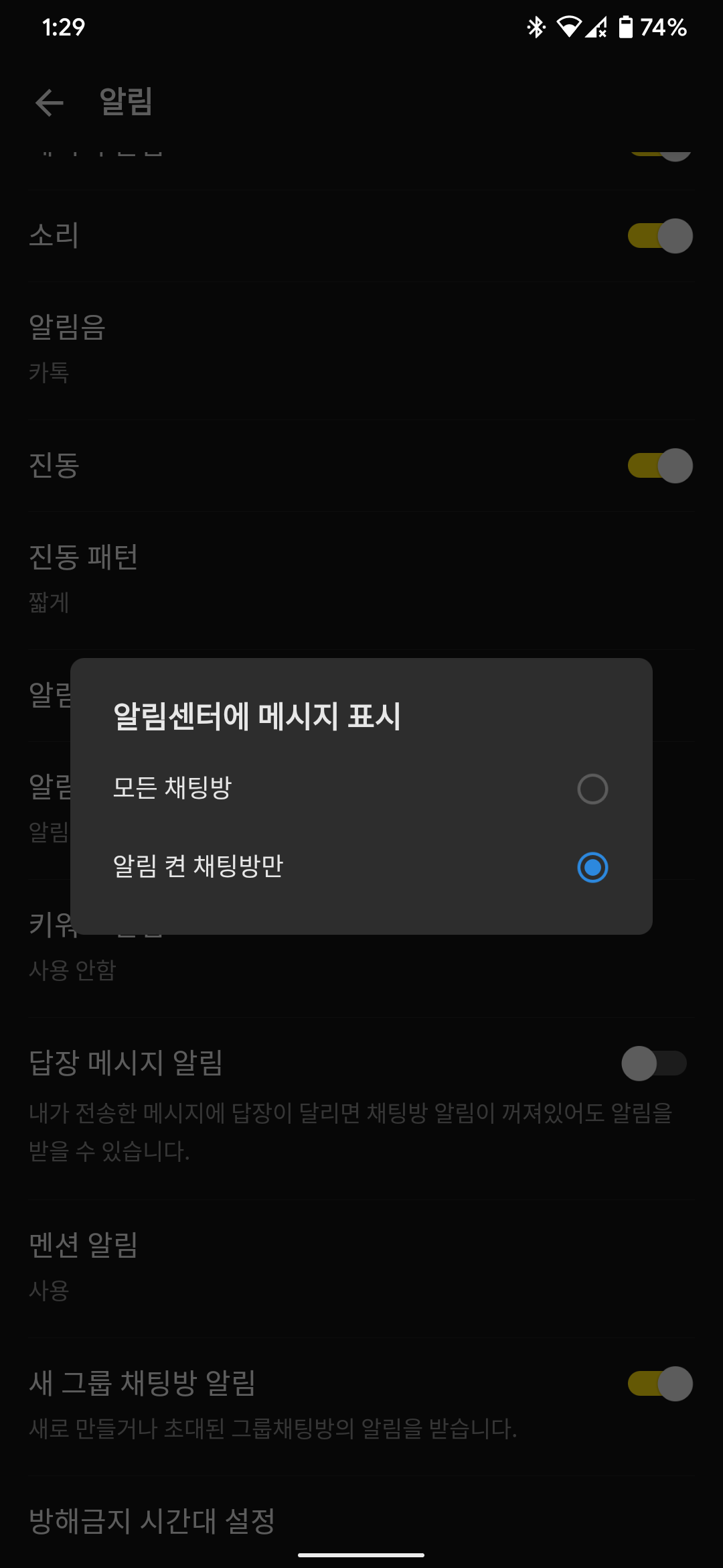 에서 아래 사진과 같이 알림 켠 채팅방만으로 선택하시면 됩니다.