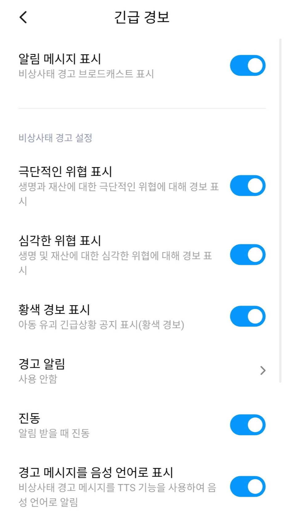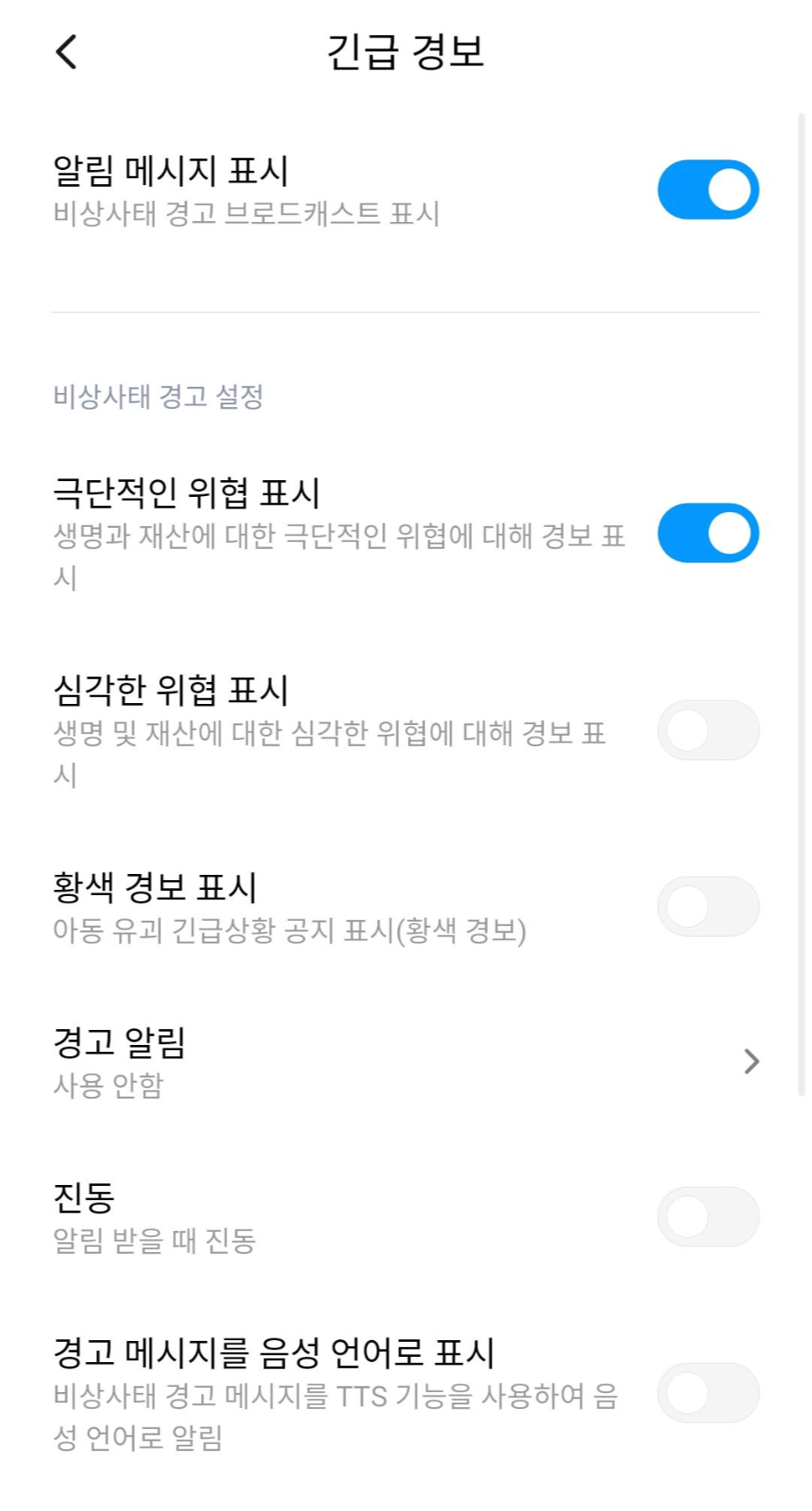 이제 아래사진과 같이 하면 전시 상황 같이 심각하게 위급한 상황에만 재난 문자를 수신받을 수 있습니다.