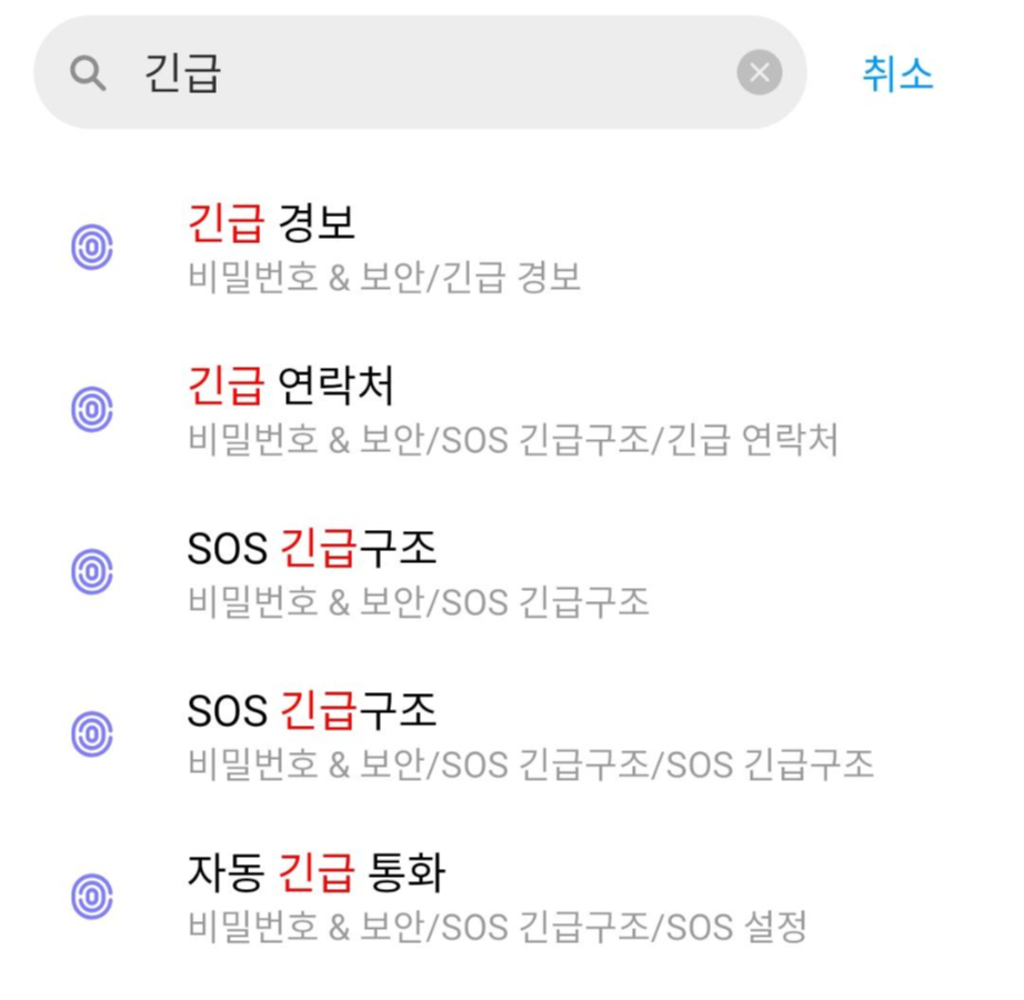 아래 사진과 같이 검색창에 긴급을 입력한후 긴급 경보를 선택하세요.