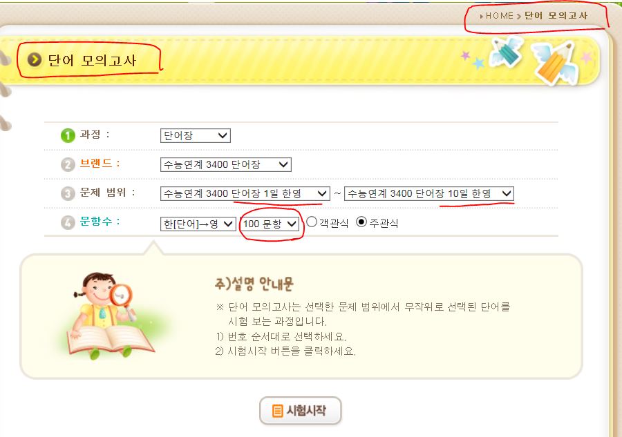 단어모의고사 기능으로 최대 100개씩 온라인으로 영어단어 학습이 가능합니다.